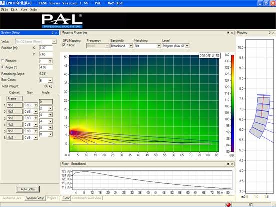 所有扩声设备的合理安装是取得良好扩声效果的基本保证,而NO2公牛线阵音箱是整个安装过程中的重点。即要声音层次清晰,清亮乐耳,低频丰满又有弹性又要保证声压覆盖均匀,无声反馈和声干涉现象发生。我们使用EASE Focus声学设计软件作现场效果模拟,完美再显了最终声场效果,及时的发现系统的弱点与不足,并在AUDIONET网络音频矩阵上做了相应的调整,规避了可能出现的一些问题,