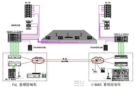 ⑵使用了pal网络音频设备TMO2800A 16进网络音频传输器1台,TMO0426A 4进12出网络音频传输器1台,TMR-240网络音频处理器1台,TME-160网络音频接口1台,M12.2调音台1台,LC348鹅颈式话筒1只,NO2公牛大型线阵音箱,ET2801低音炮,TV718M返听音箱,Q系列数字功放等。